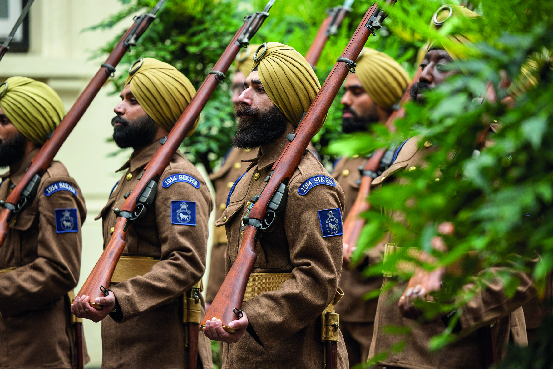 Known as The 1914 Sikh Ceremonial March Troop and comprising personnel from the army, Royal Air Force and Royal Navy, they were presented with the 1914 Sikhs standard ahead of a remembrance service for those killed at the First Battle of Ypres.