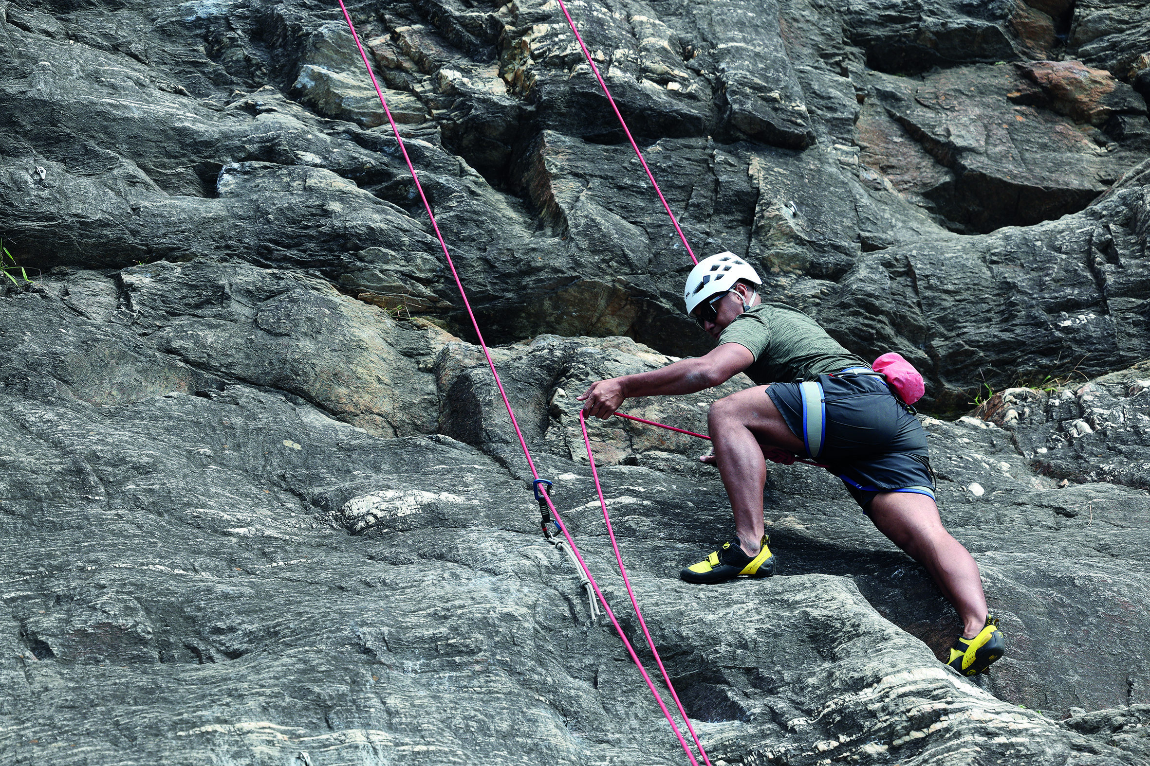 After a few minutes’ pause, one of the figures swings out across the face, grasping for the next handhold before hauling themselves upright, while the whoops of their companions drift faintly down the valley.